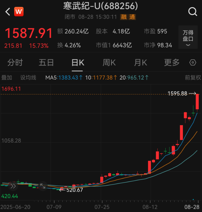 8月28日,寒武纪股价大幅收涨15.73%,收于1587.91元/股,超越贵州茅台,位居A股第一。8月27日,寒武纪股价也曾一度超过茅台。