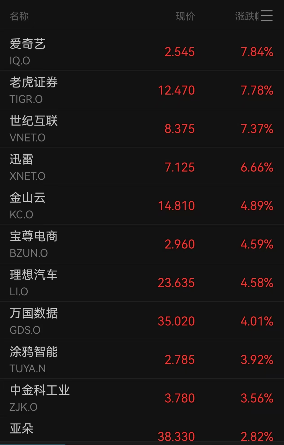 截至23:00左右,纳斯达克中国金龙指数涨约0.2%,爱奇艺、老虎证券、世纪互联涨幅居前,其中多家公司业绩报喜,如老虎证券二季度营收同比增长58.7%,创历史新高;世纪互联二季度营收同比增长22.1%。