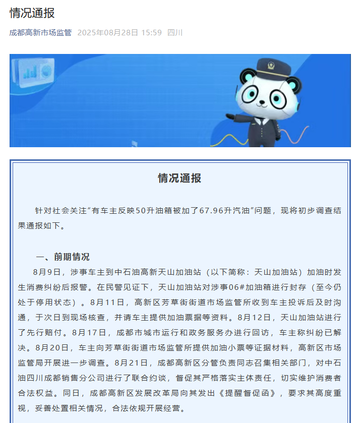8月9日,涉事车主到中石油高新天山加油站(以下简称:天山加油站)加油时发生消费纠纷后报警。在民警见证下,天山加油站对涉事06#加油枪进行封存(至今仍处于停用状态)。8月11日,高新区芳草街街道市场监管所收到车主投诉后及时沟通,于次日到现场核查,并请车主提供加油票据等资料。8月12日,天山加油站进行了先行赔付。8月17日,成都市城市运行和政务服务办进行回访,车主称纠纷已解决。8月20日,车主向芳草街街道市场监管所提供加油小票等证据材料,高新区市场监管局开展进一步调查。8月21日,成都高新区分管负责同志召集相关部门,对中石油四川成都销售分公司进行了联合约谈,督促其严格落实主体责任,切实维护消费者合法权益。同日,成都高新区发展改革局向其发出《提醒督促函》,要求其高度重视,妥善处置相关情况,合法依规开展经营。