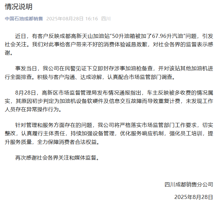 8月28日,高新区市场监督管理局发布情况通报指出,车主反映被多收费的情况属实,其原因初步判定为加油机设备软硬件及信息交互故障而导致重复计费,未发现工作人员存在异常操作行为。