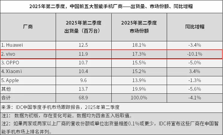 对于vivo而言,这种行业性瓶颈表现得尤为明显,尽管2025年第二季度仍以1190万台的出货量和17.3%的市场份额位居中国市场第二,但整体市场同比下降4%的颓势,意味着传统增长模式已难以为继。