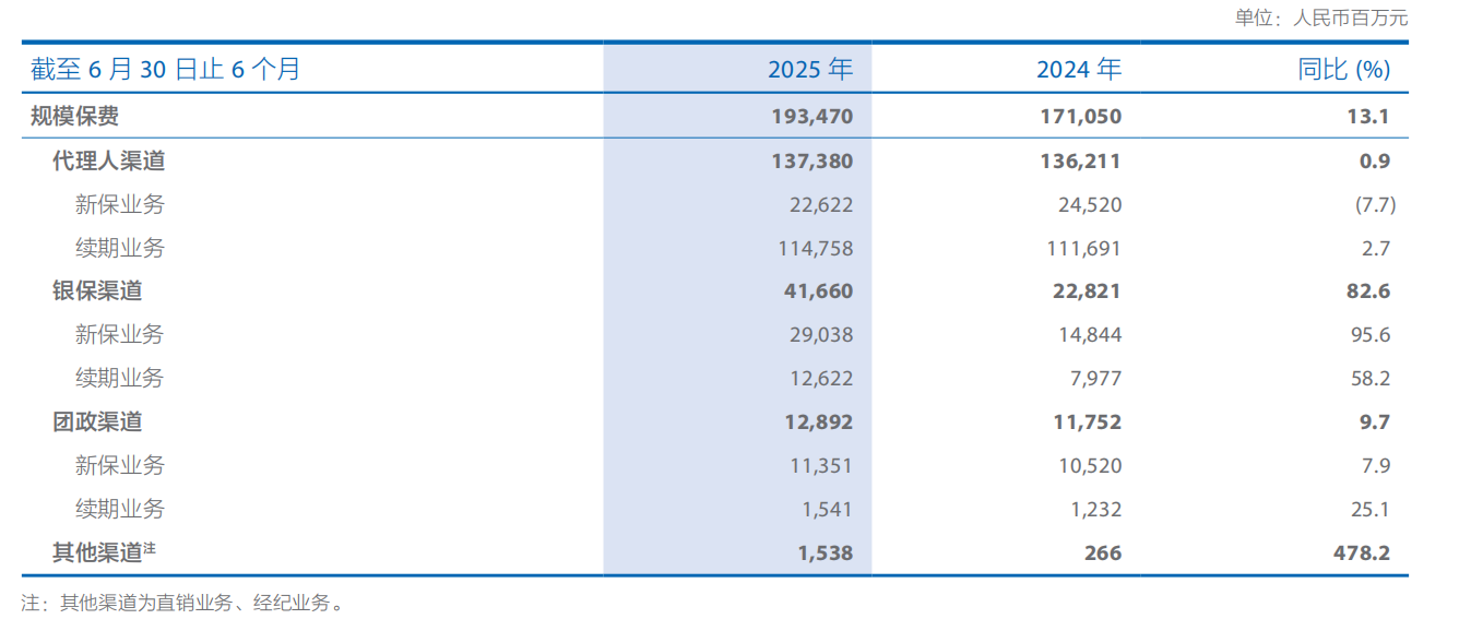 分渠道来看,代理人渠道依然是保费规模的压舱石,上半年保费规模1373.8亿元,同比微增0.9%;而银保渠道则成为了新增长引擎,上半年保费规模416.6亿元,同比大幅增长82.6%;另外,团政渠道上半年实现保费128.92亿元,同比增长9.7%;其他渠道上半年实现保费15.38亿元,同比增长478.2%。