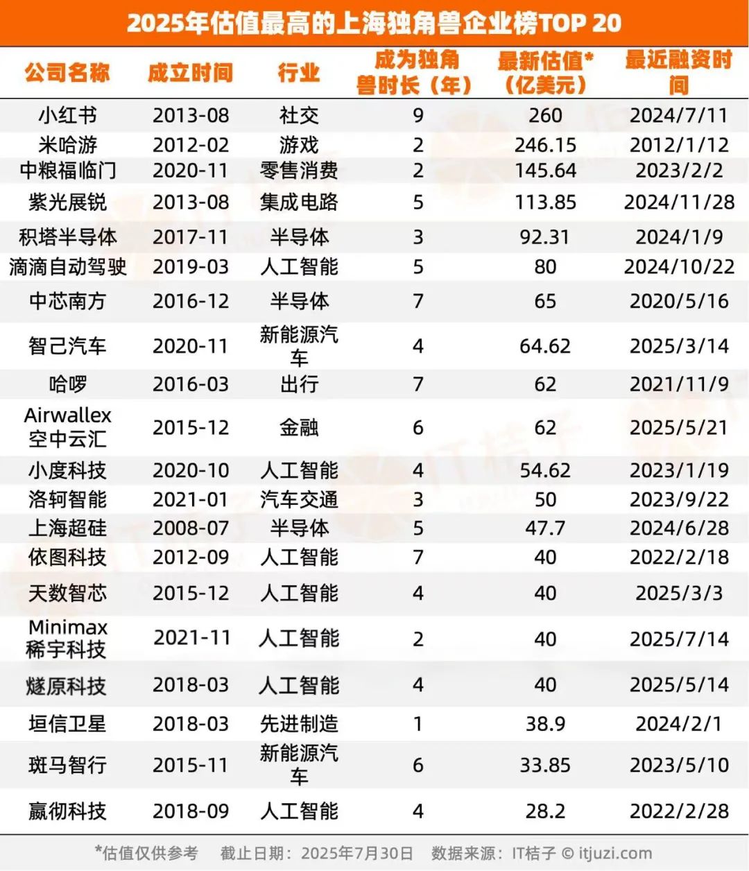 超百亿美元的上海独角兽有4家,其中小红书(260亿美元)和米哈游(246.15亿美元)估值显著高于其他企业,两者合计506.15亿美元,这种头部效应既源于其高用户粘性和市场地位,也得益于成熟的商业化模式(广告、电商、游戏付费)。