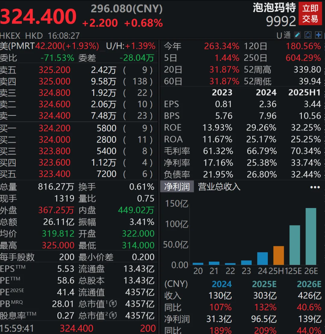 王宁看好迷你LABUBU的再度爆火,认为它的使用场景更多,“相信它会是一个超级受欢迎的爆款。”不过,从股价来看,迷你LABUBU的发售并未带动股价大幅上涨。8月28日,泡泡玛特港股收盘报价324.4港元/股,仅上涨0.68%,市值站上4300亿港元。