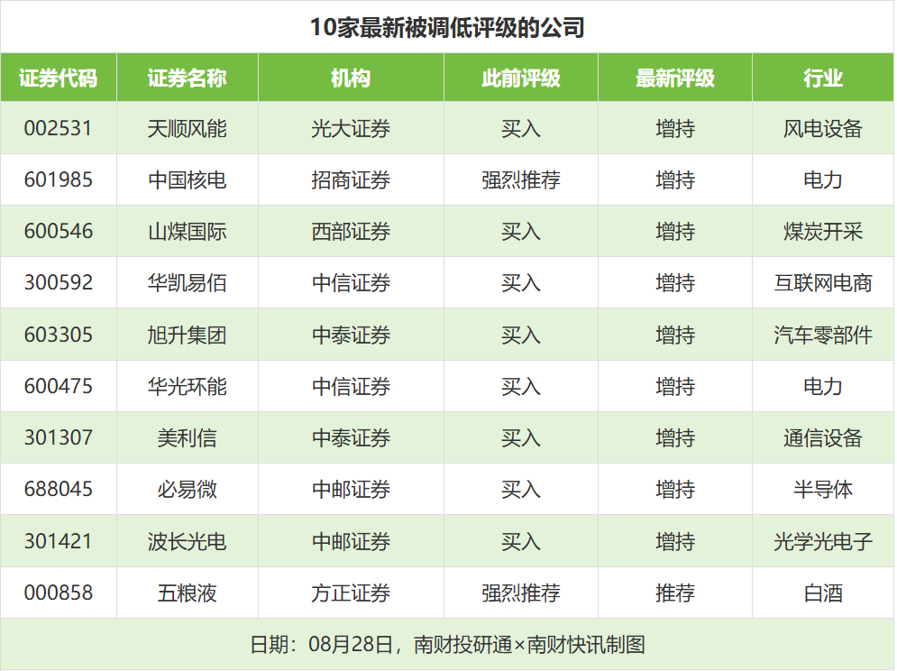 评级调低方面,8月28日,券商调低上市公司评级达到10家次,最新数据包括了光大证券对天顺风能的评级从“买入”调低至“增持”,招商证券对中国核电的评级从“强烈推荐”调低至“增持”,西部证券对山煤国际的评级从“买入”调低至“增持”,方正证券对五粮液的评级从“强烈推荐”调低至“推荐”。
