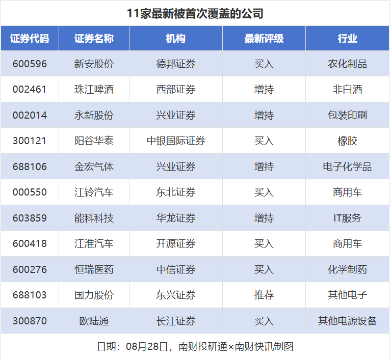 首次覆盖方面,8月28日券商共给出了11次首次覆盖,其中新安股份获得德邦证券给予“买入”评级,珠江啤酒获得西部证券给予“增持”评级,永新股份、金宏气体获得兴业证券分别给予“增持”“增持”评级,阳谷华泰获得中银国际证券给予“买入”评级。