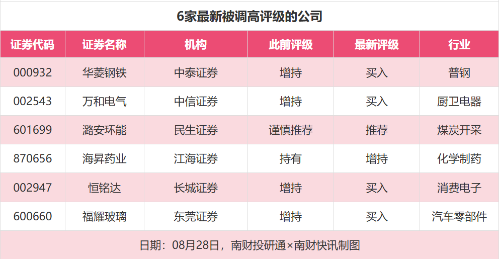 评级调高方面,8月28日,券商调高上市公司评级达到6家次,最新数据包括了中泰证券对华菱钢铁的评级从“增持”调高至“买入”,中信证券对万和电气的评级从“增持”调高至“买入”,民生证券对潞安环能的评级从“谨慎推荐”调高至“推荐”。