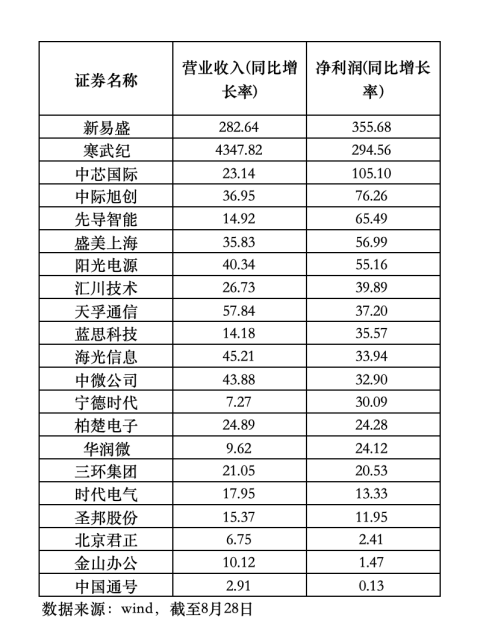 值得一提的是,在已经披露中报业绩的公司中,新易盛、寒武纪的上半年营业收入、净利润的同比增速均超三位数,中芯国际、天孚通信、海光信息、阳光电源、中际旭创均交出了十分亮眼的中报成绩。
