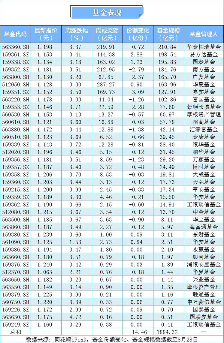 本周39只中证A500基金全红,所有基金涨幅均超1.5%,其中,国联安以4.72%的涨幅位居榜首。从规模来看,当前中证A500基金总规模达1884.32亿元,较上周有所上升。具体到单只基金,规模排名前三的为华泰柏瑞、易方达基金、国泰基金,规模依次为210.84亿元、198.54亿元、195.83亿元。