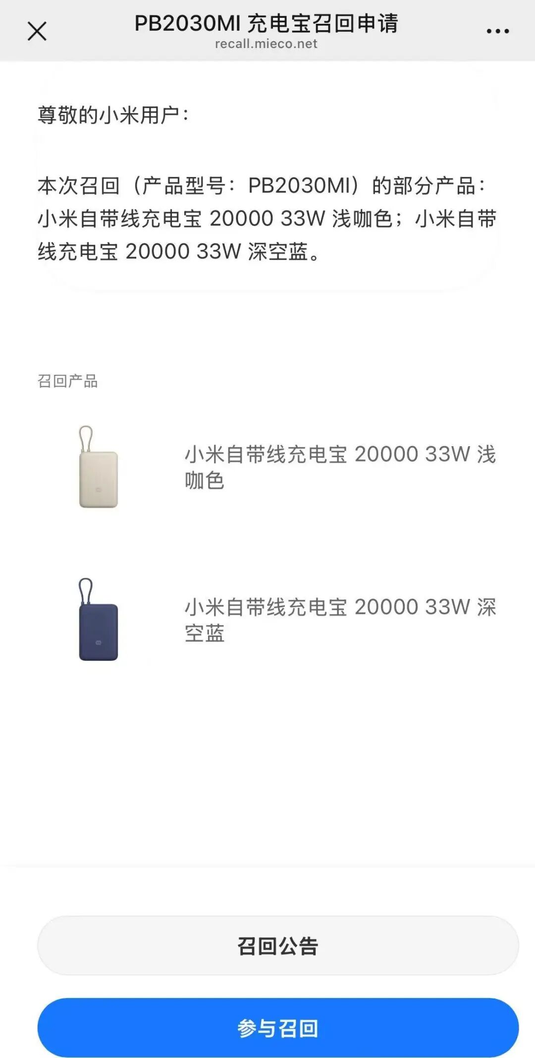 小米服务还表示,召回产品可选择到线下小米之家门店进行退货退款或线上处理,还可以自行将缺陷产品进行无害化处理,“该型充电宝采用不同厂家供应商电芯,少量产品使用了相关电芯,不在召回范围内的产品可以放心使用。”