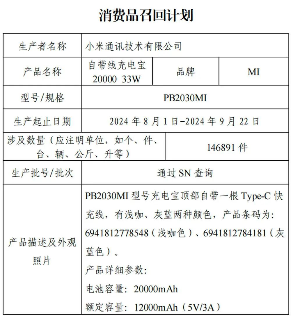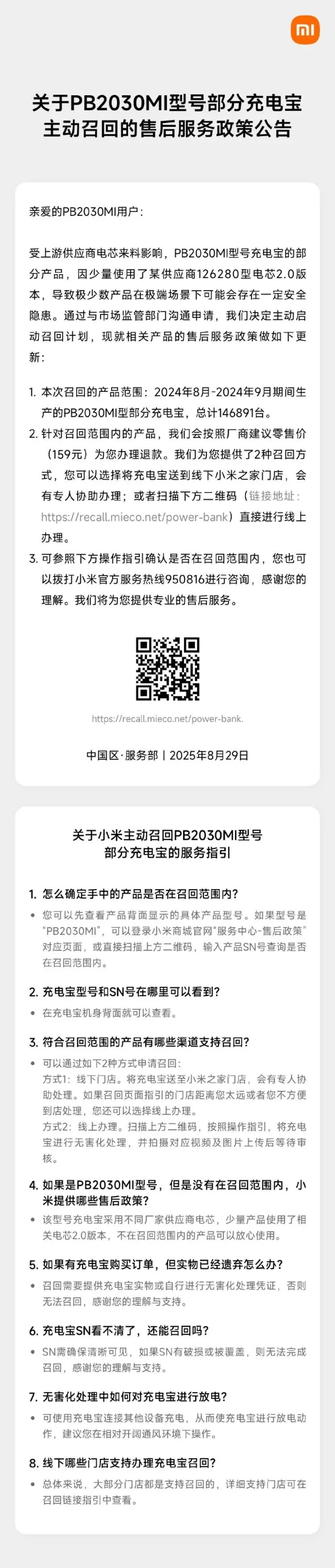 通过与市场监管部门沟通申请,小米决定主动启动召回计划。 本次召回的产品范围为2024年8月—2024年9月期间生产的PB2030MI型部分充电宝,总计146891台。针对召回范围内的产品,小米会按照厂商建议零售价(159元)办理退款。