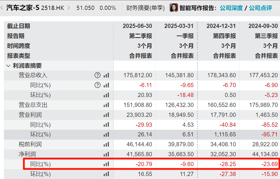 带给股东和投资者打击的,不仅仅是这一份不漂亮的财务报表,而是汽车之家连续几个季度的净利润大幅下滑。从去年三季度开始,汽车之家的净利润下滑速度加快,当季度同比降幅达到23.69%;去年四季度的净利润同比降幅进一步加大,达到了28.25%,是自2022年第二季度以来的同比最大降幅,可以说是大“翻车”。