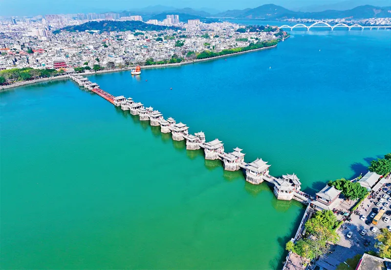位于广东潮州古城东门外的广济桥始建于南宋年间,集梁桥、浮桥、拱桥于一体,被誉为“世界上最早的启闭式桥梁”。2020年10月,习近平总书记在广济桥考察时指出,广济桥历史上几经重建和修缮,凝聚了不同时期劳动人民的匠心和智慧,具有重要的历史、科学、艺术价值,是潮州历史文化的重要标志。图为2024年2月13日拍摄的广济桥。 人民图片 孙继虎/摄