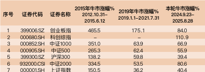回顾历史表现,创业板指在两轮牛市中均位居主流宽基指数涨幅前列。