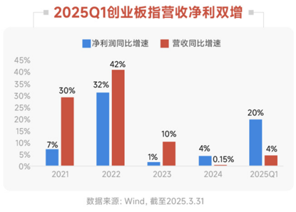 从基本面看,创业板盈利拐点已清晰显现。2025年一季度,创业板指实现营收与净利润同比双增,其中净利润增速达20%,表现尤为突出,为指数上涨提供了扎实的业绩支撑。