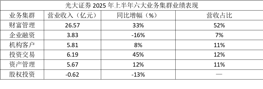 从业务板块来看,光大证券旗下六大业务集群的营收表现呈现分化态势。其中,财富管理与投资交易两大业务的业绩表现突出,成为驱动公司总营收增长的主要引擎。