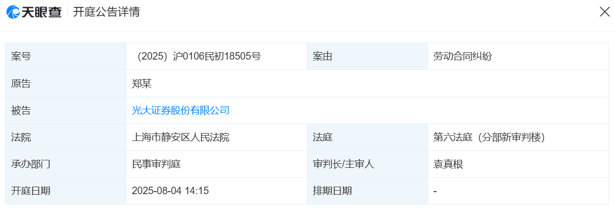 此外,光大证券的2024年报中,同样出现了一条涉及劳动纠纷的“天价”诉讼事项:2025年2月,郑某某因劳动合同纠纷,向光证资管(光大证券作为第三人)提起诉讼,涉案金额约为2356.9万元。该案由上海市浦东新区人民法院受理,已于6月30日开庭。