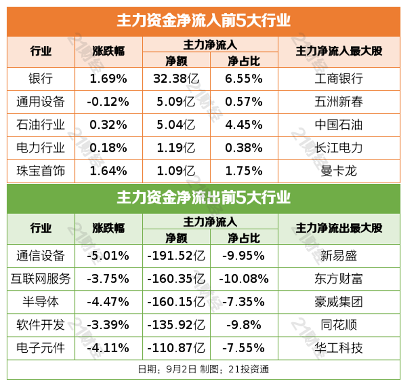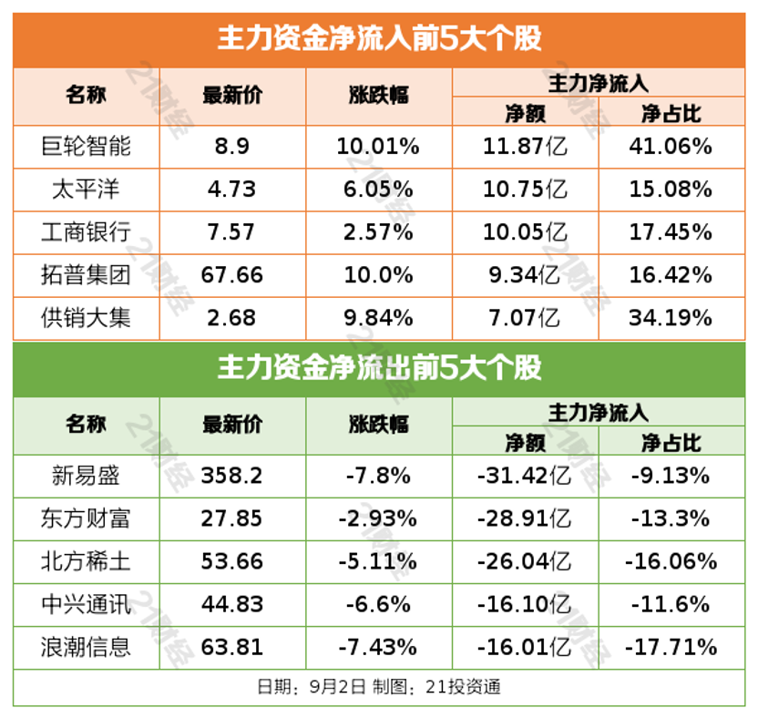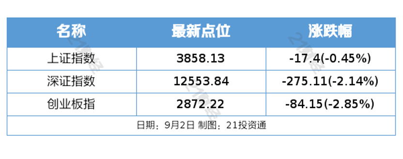 9月2日,A股集体下跌,截至收盘,上证指数跌0.45%,深证成指跌2.14%,创业板指跌2.85%,北证50涨0.4%。沪深京三市全天成交额29124亿元,较上日放量1348亿元。全市场超4000只个股下跌。
