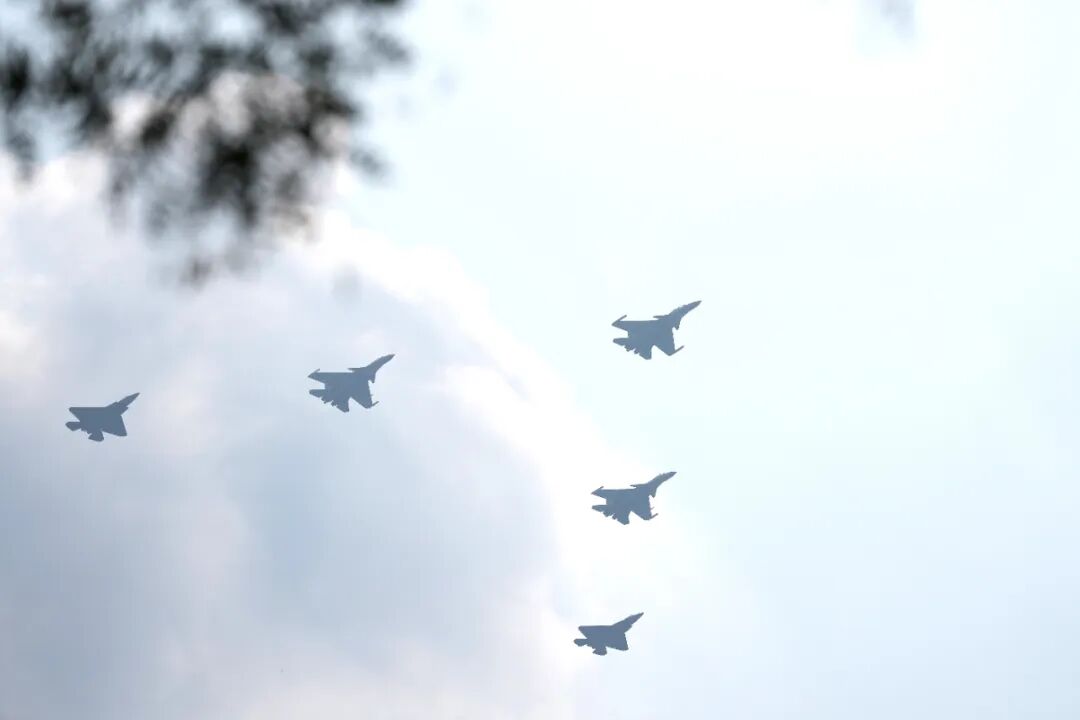 9月3日,纪念中国人民抗日战争暨世界反法西斯战争胜利80周年大会在北京隆重举行。这是观众拍摄空中护旗梯队通过天安门广场。新华社记者 欧东衢 摄