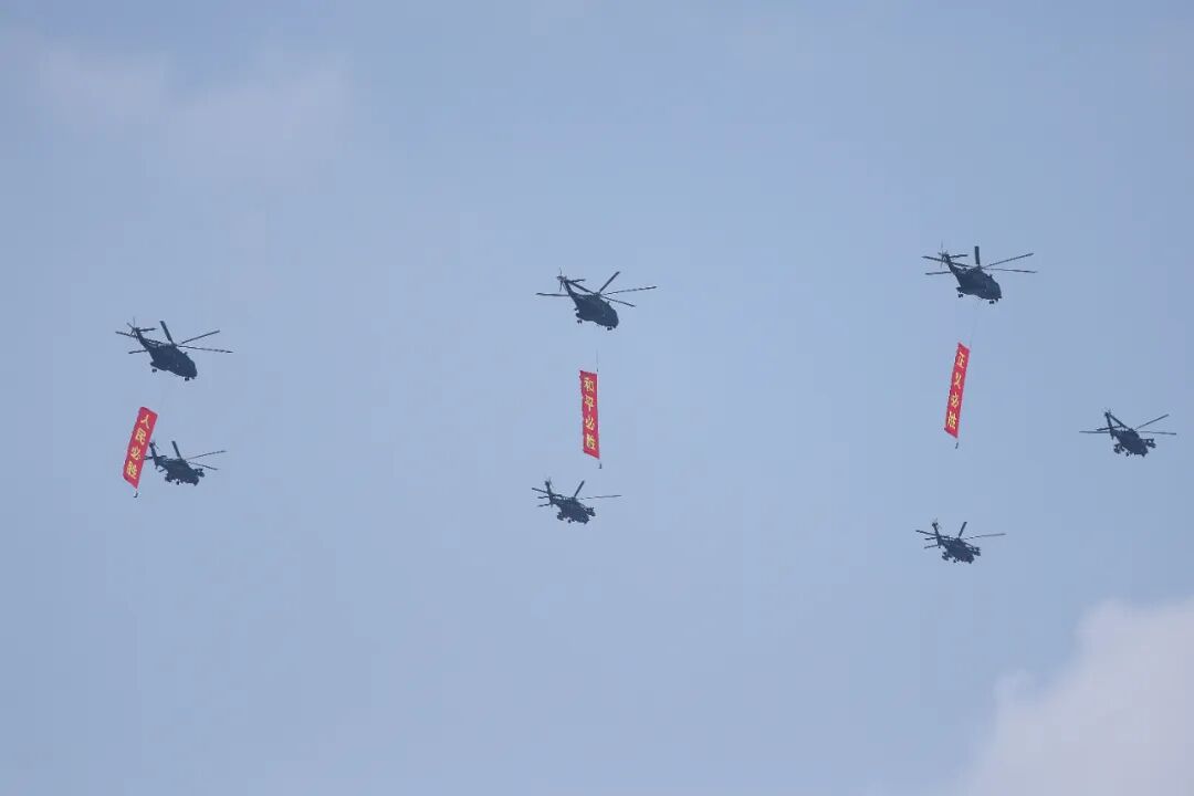 9月3日,纪念中国人民抗日战争暨世界反法西斯战争胜利80周年大会在北京隆重举行。这是空中护旗梯队。新华社记者 杨植森 摄