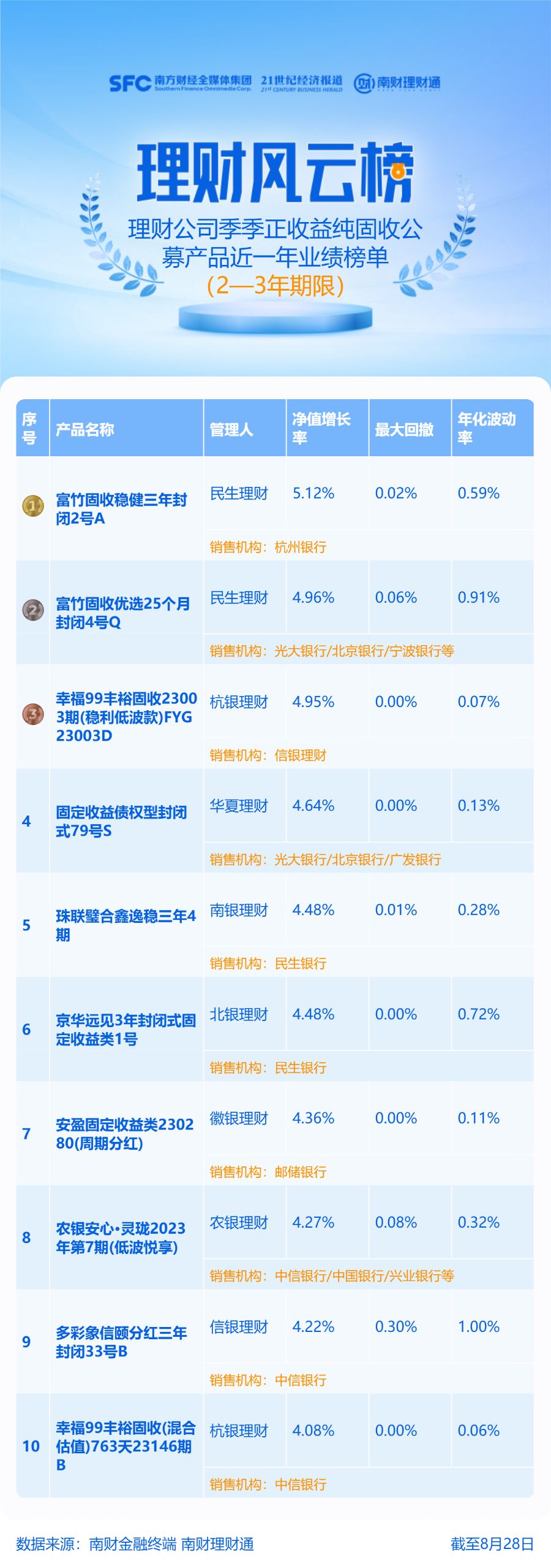 产品统计范围为理财公司发行的投资周期在2—3年(含)的纯固收公募产品,上榜产品满足近1年每个完整的自然季均实现正收益。产品统计截止日期为2025年8月28日,统计区间为近1年。