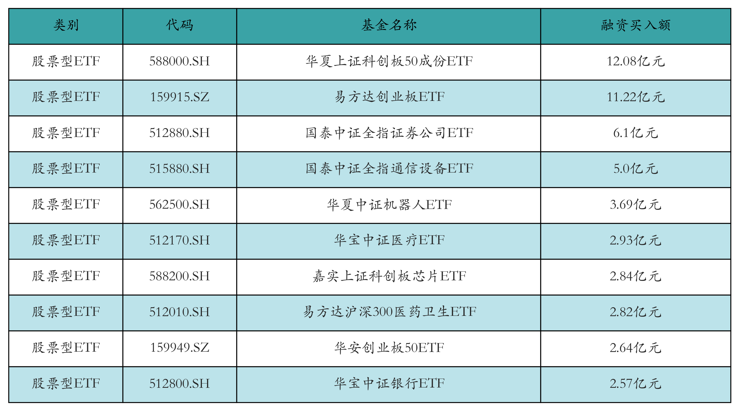 昨日股票型ETF融资买入额最高的3只ETF及其买入金额分别为:华夏上证科创板50成份ETF(12.08亿元)、易方达创业板ETF(11.22亿元)、国泰中证全指证券公司ETF(6.1亿元)。融资买入额前10详情见下表: