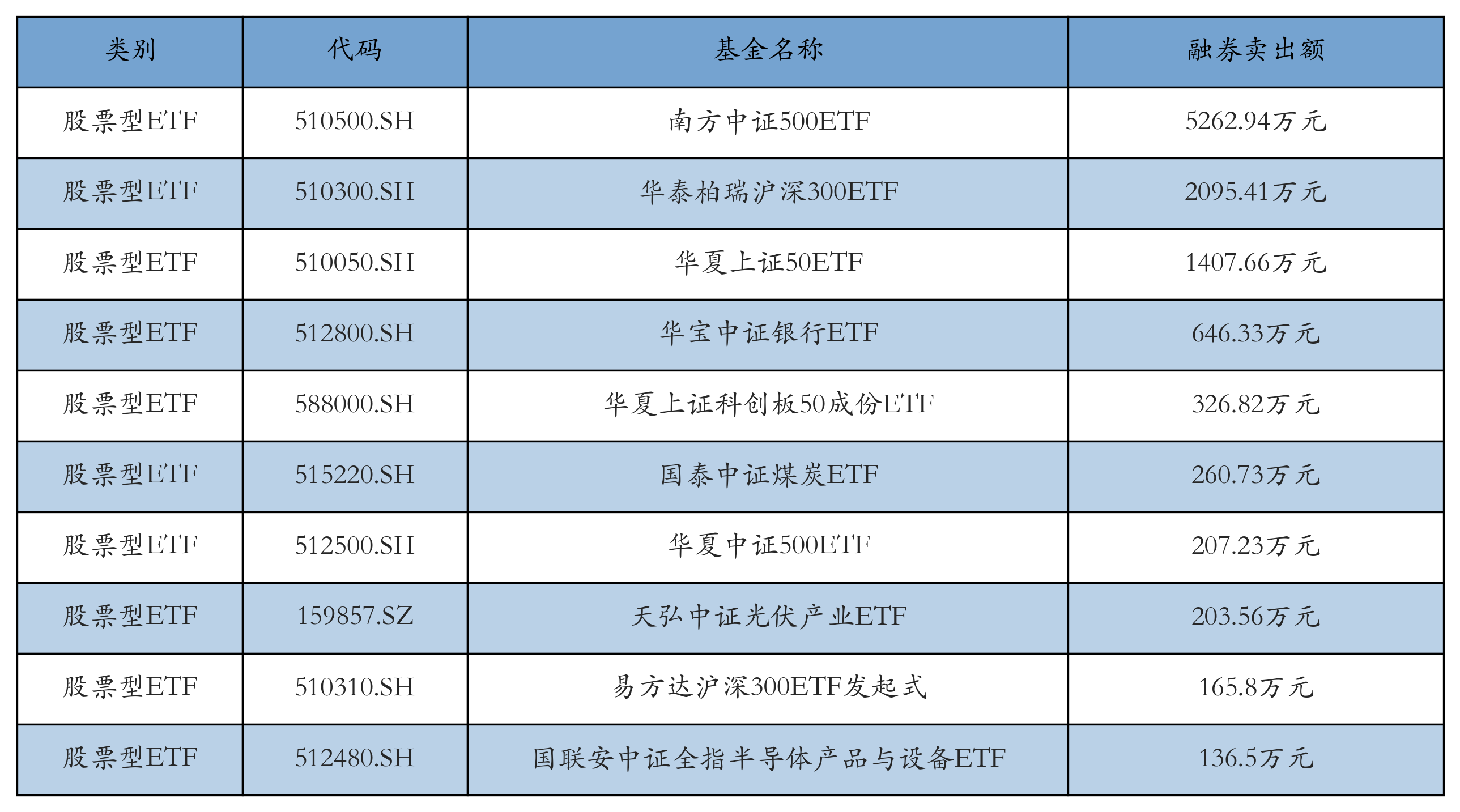 昨日股票型ETF融资卖出额最高的3只ETF及其卖出金额分别为:南方中证500ETF(5262.94万元)、华泰柏瑞沪深300ETF(2095.41万元)、华夏上证50ETF(1407.66万元)。融券卖出额前10详情见下表: