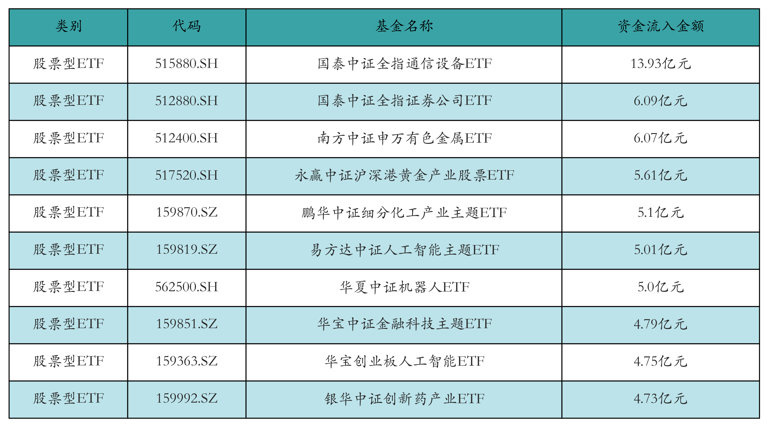 昨日股票型ETF资金流入最多的3只ETF及其流入金额分别为:国泰中证全指通信设备ETF(流入13.93亿元)、国泰中证全指证券公司ETF(流入6.09亿元)、南方中证申万有色金属ETF(流入6.07亿元)。资金流入前10详情见下表: