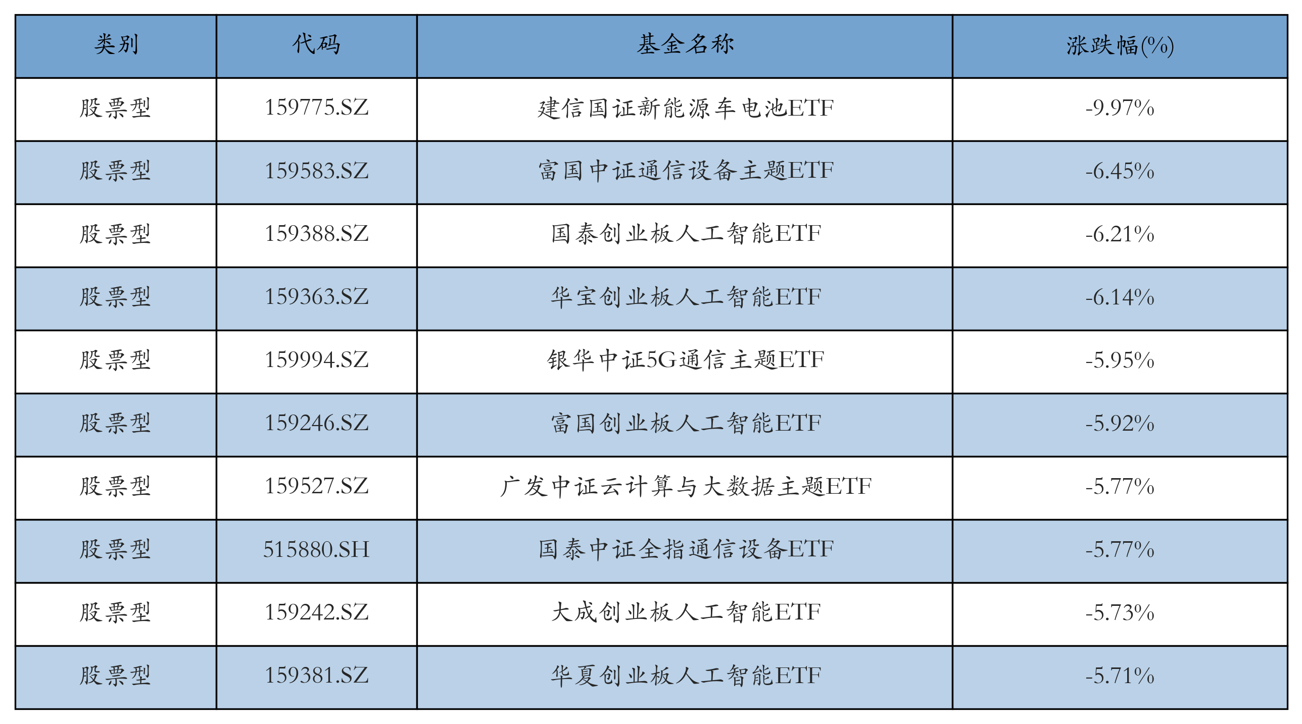 昨日股票型ETF跌幅最大的3只ETF及其收益率分别为:建信国证新能源车电池ETF(-9.97%)、富国中证通信设备主题ETF(-6.45%)、国泰创业板人工智能ETF(-6.21%)。跌幅前10详情见下表: