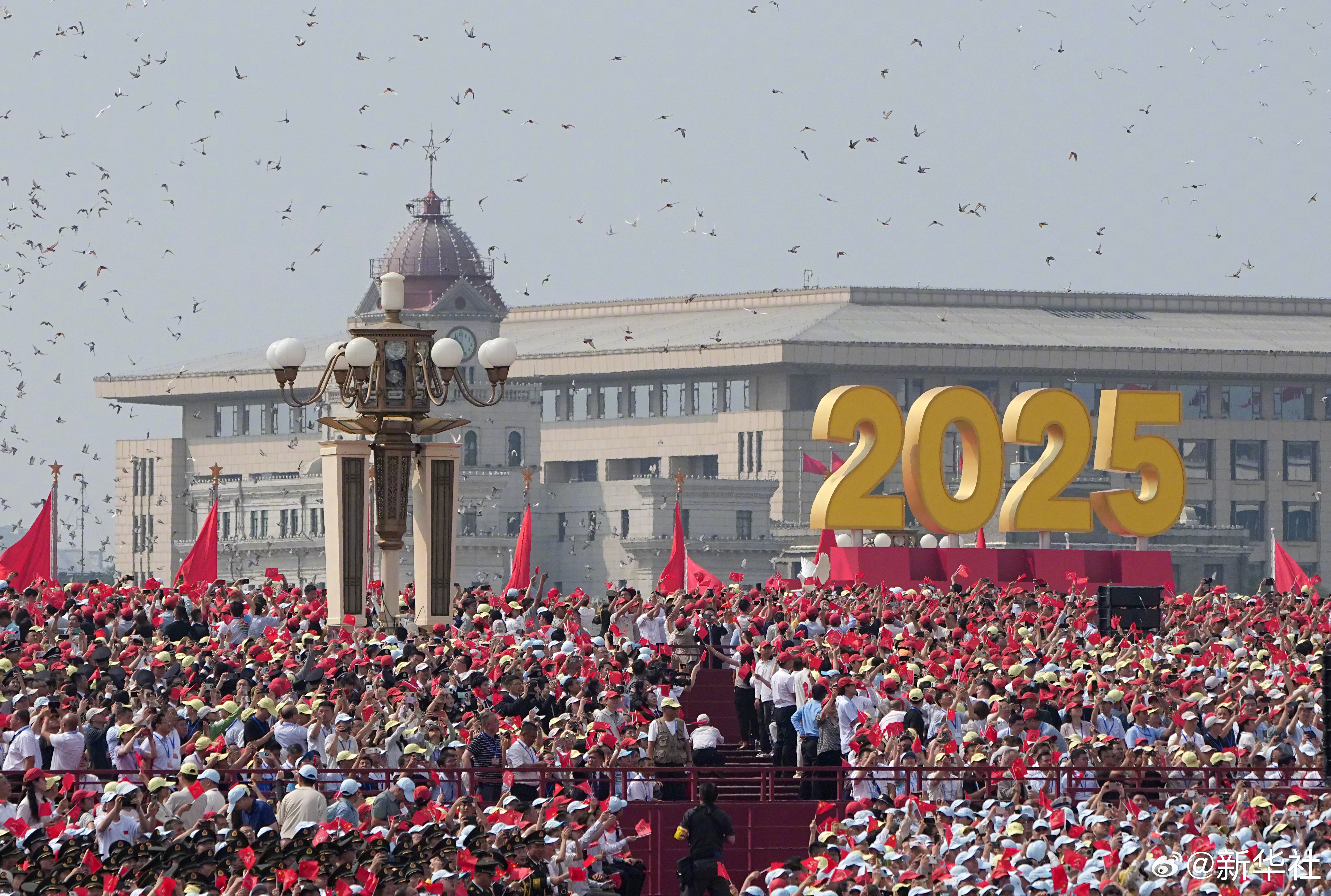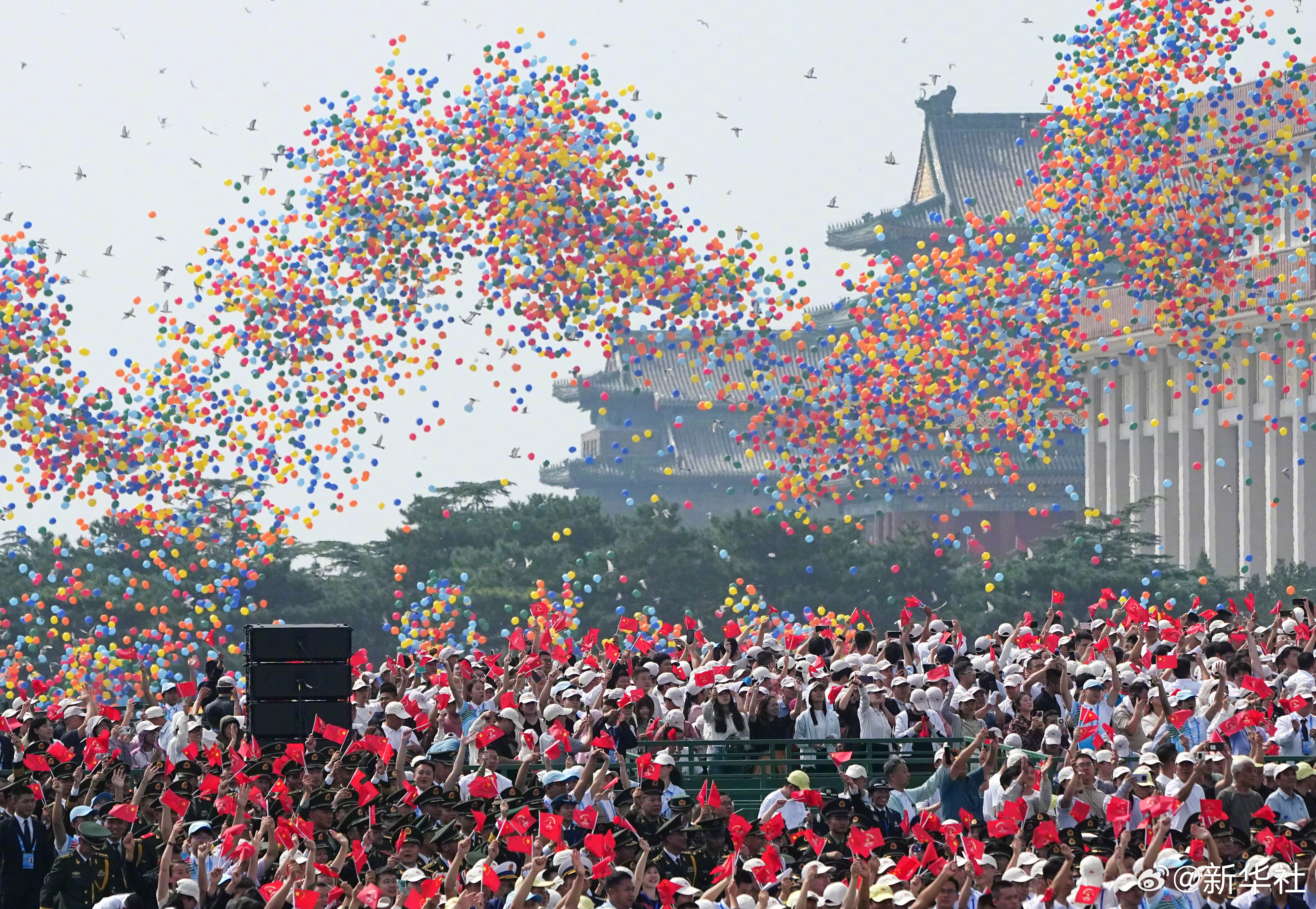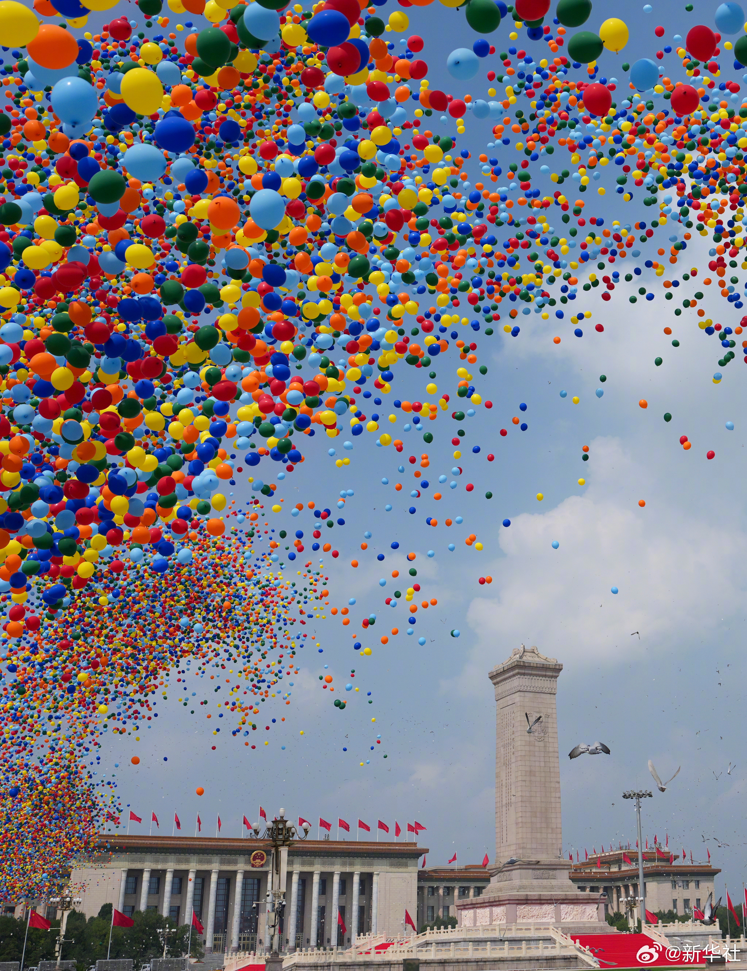 和平鸽展翅高飞,彩色气球腾空而起!回望峥嵘的血火岁月,让我们以山河为证、以日月为铭,共同见证,英雄的中国人民永远不屈,和平的阳光永远灿烂!让我们为胜利喝彩为祖国点赞!