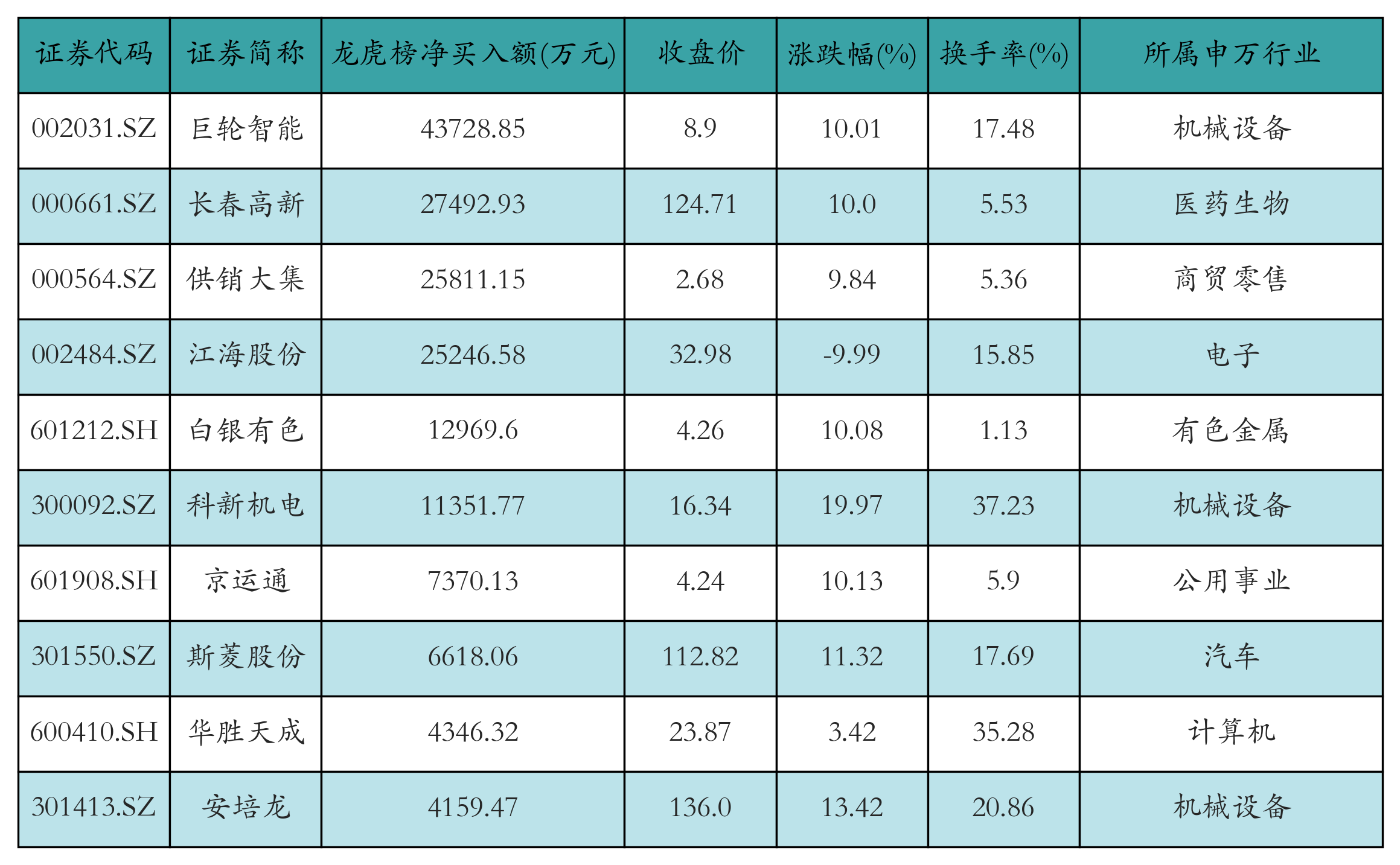 昨日龙虎榜营业部净买入额前10详情见下表: