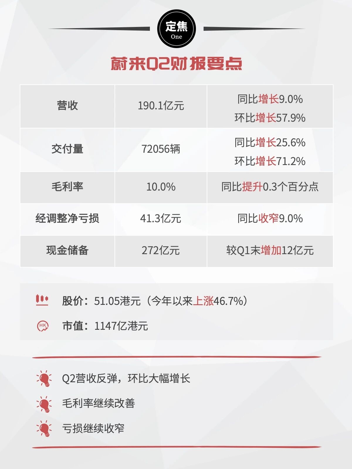 资本市场对蔚来的表现给予了积极回应,蔚来股价今年以来上涨46.7%,目前达到52.35港元,市值回升至1176亿港元。