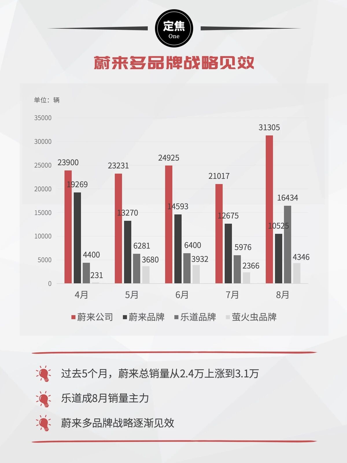 财务数据复苏的前提,是蔚来的多品牌战略开始奏效。蔚来主品牌专注高端市场,保持品牌调性;乐道品牌主攻家庭市场,以性价比取胜;萤火虫品牌定位小车市场,三个品牌各司其职。