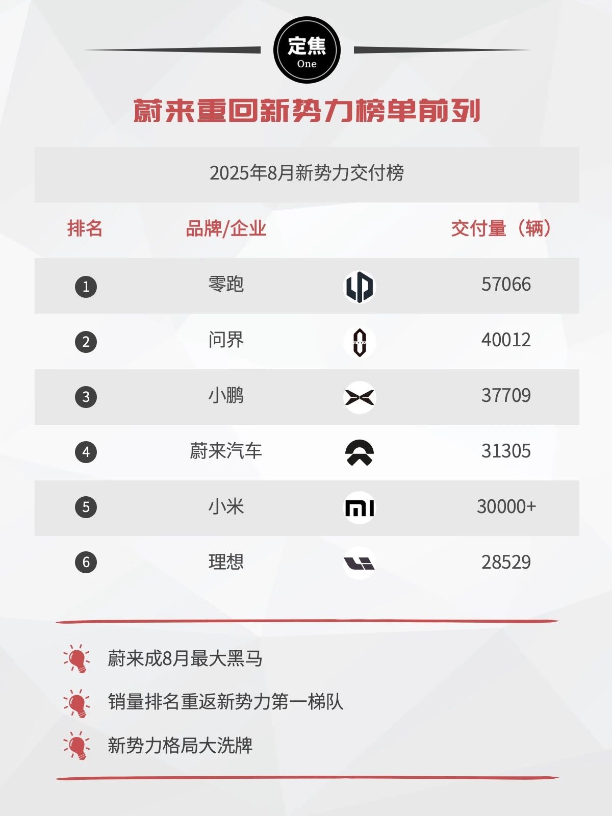 8月交付数据进一步印证了市场信心的回升:蔚来8月交付31305台,环比提升近50%,其中乐道品牌交付16434台,firefly萤火虫交付4346台。这一强劲表现不仅延续了Q2的增长势头,更为公司实现全年目标增添了信心。