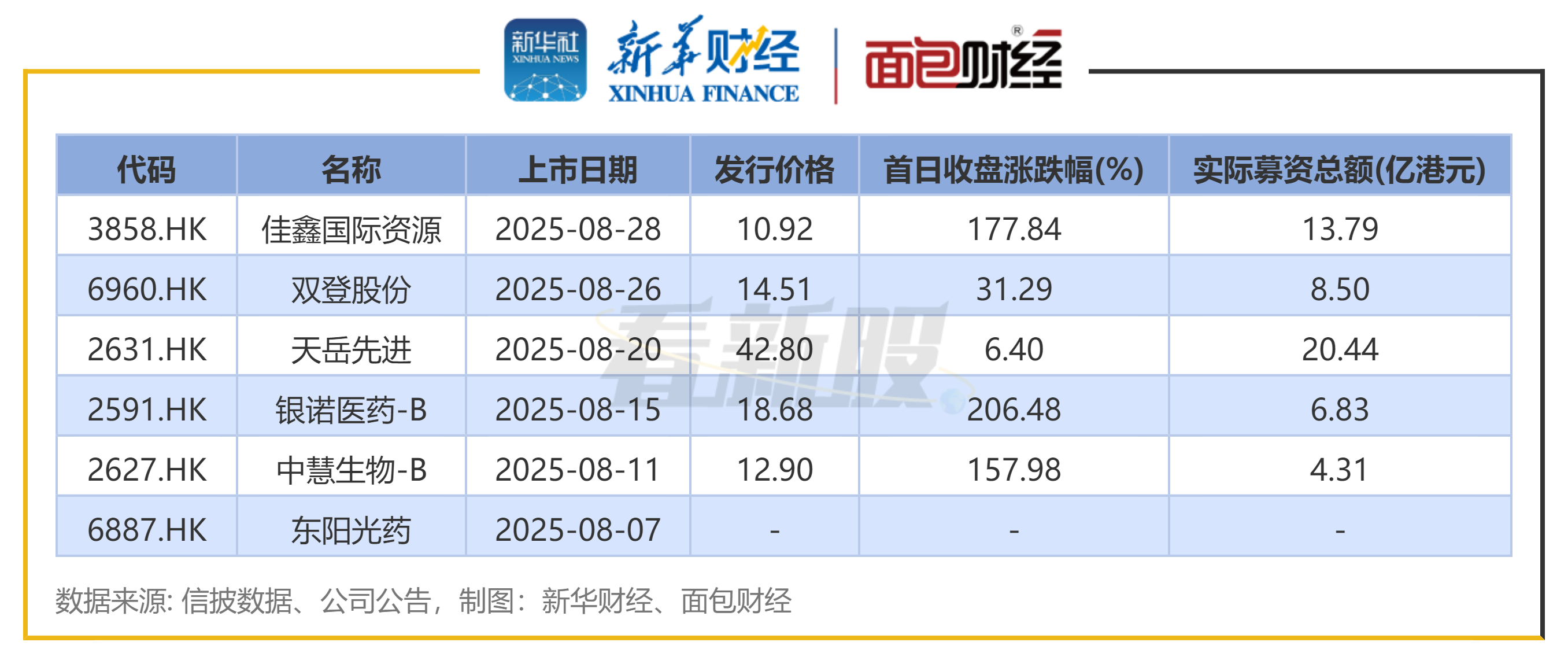 8月上市新股中,天岳先进募资总额达20.44亿港元,规模最大。佳鑫国际资源紧随其后,募集约13.79亿港元。另外,双登股份、银诺医药-B、中慧生物-B募资低于10亿港元。东阳光药因采用介绍上市,通过吸收合并子公司东阳光长江药业实现整体上市,无募集资金。