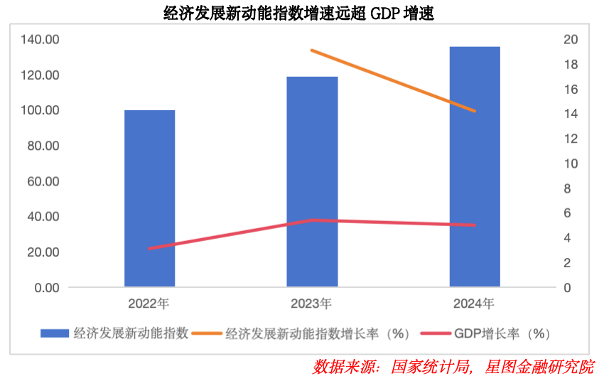并且,经济发展新动能指数增速同样亮眼,2024年同比增长14.2%,显著高于同期GDP 增速,表明代表新质生产力的产业正进入快速发展阶段,经济转型升级成效逐步显现。