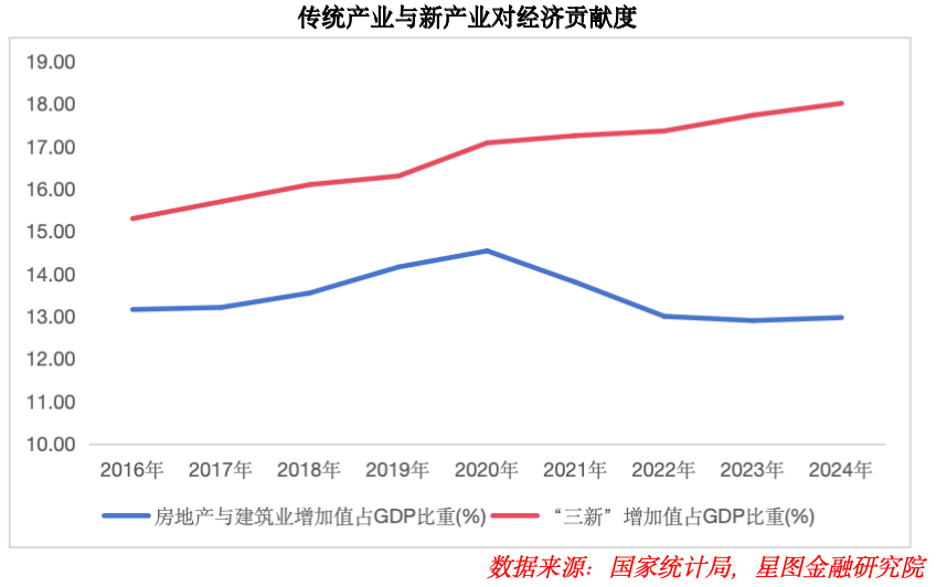 首先,从宏观经济结构来看,我国传统产业占比持续下降,2024年房地产与建筑业增加值占GDP比重已降至12.97%,较2020年峰值下降超1个百分点,经济对房地产的依赖度逐步减弱;与之相对,以高科技为核心的新产业规模快速扩张,2024年我国“三新”增加值占GDP比重提升至18.01%。同时,我国高新技术产业投资规模保持高速增长,2024年高技术产业投资比上年增长8.0%,较全部投资增速快4.8个百分点。