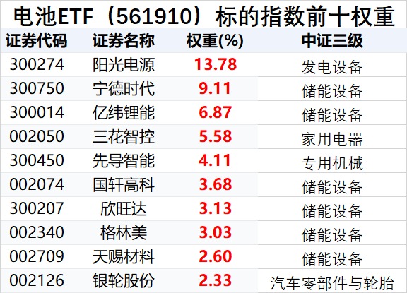 资料显示,电池ETF(561910)跟踪CS电池指数,选取业务涉及动力电池、储能电池、消费电子电池以及相关产业链上下游的上市公司证券作为指数样本,前十大权重股包含阳光电源、宁德时代、三花智控、亿纬锂能、国轩高科、先导智能、格林美、欣旺达、银轮股份等股。行业分布上,更侧重对储能及发电设备覆盖。