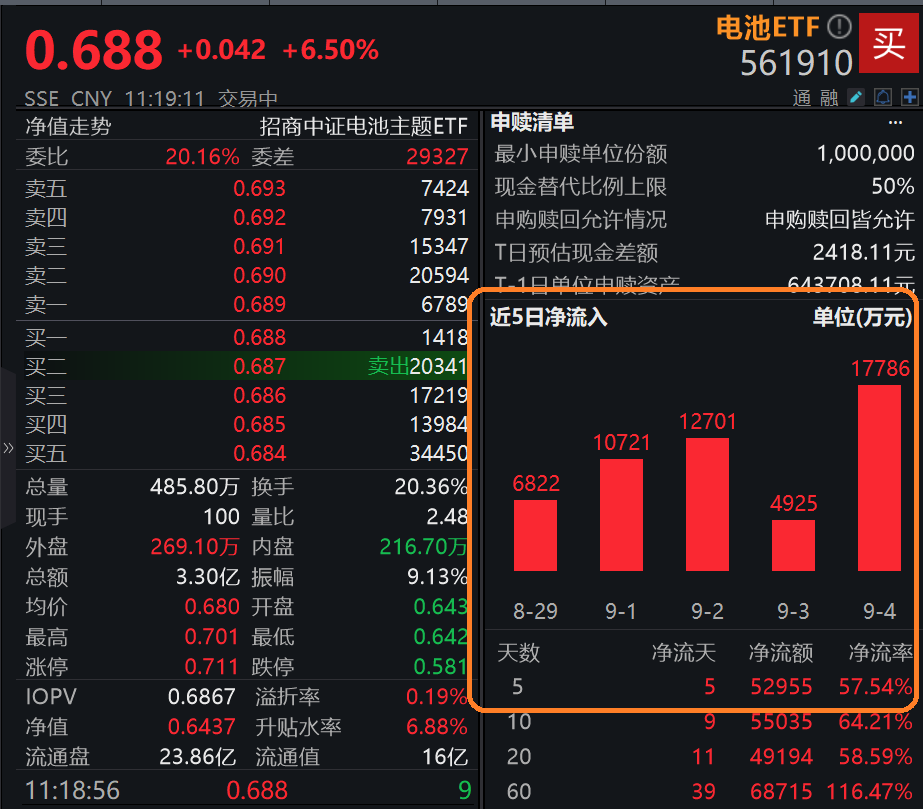 相关主题ETF资金面上,电池ETF(561910)近5日持续获资金净流入,累计“吸金”近5.3亿元。
