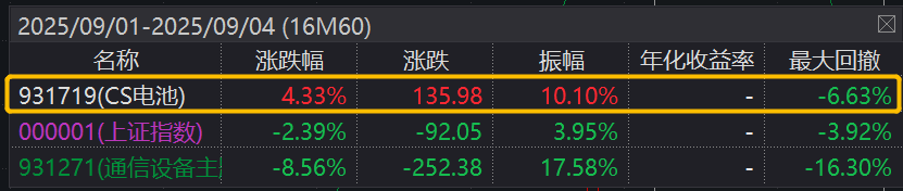 数据显示,本周以来(9月1日-9月4日)沪指连续回调,区间跌幅2.39%,热门的通信设备大跌8.56%,CS电池指数逆市上涨4.33%。