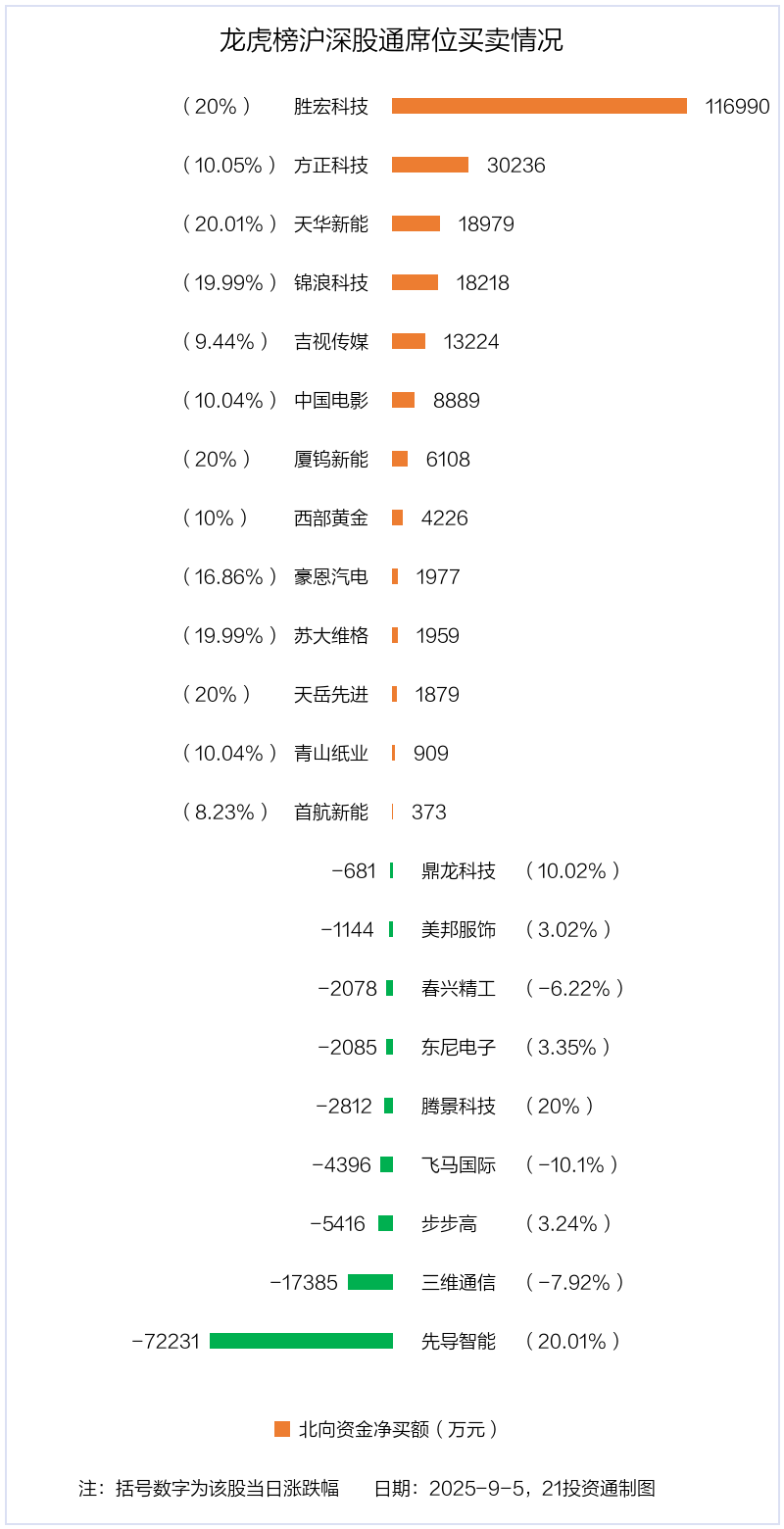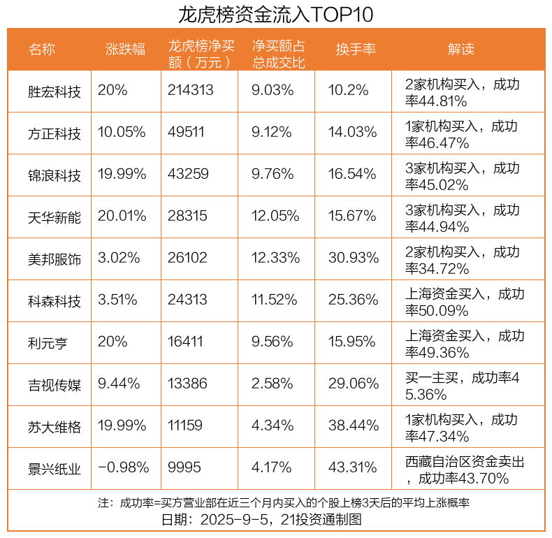 9月5日,上证指数上涨1.24%,深证成指上涨3.89%,创业板指上涨6.55%。盘后龙虎榜数据显示,共有59只个股因当日异动登上龙虎榜,资金净流入最多的是胜宏科技(300476.SZ),达21.43亿元。