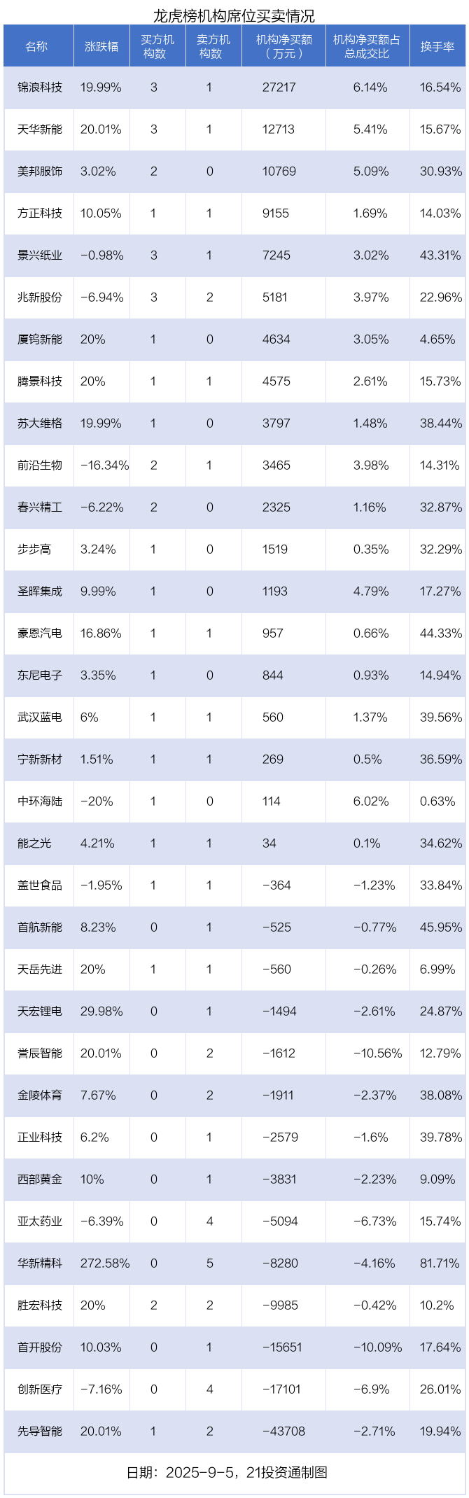 其中,机构净买入金额最多的是锦浪科技(300763.SZ),当日收盘上涨19.99%,换手率为16.54%。