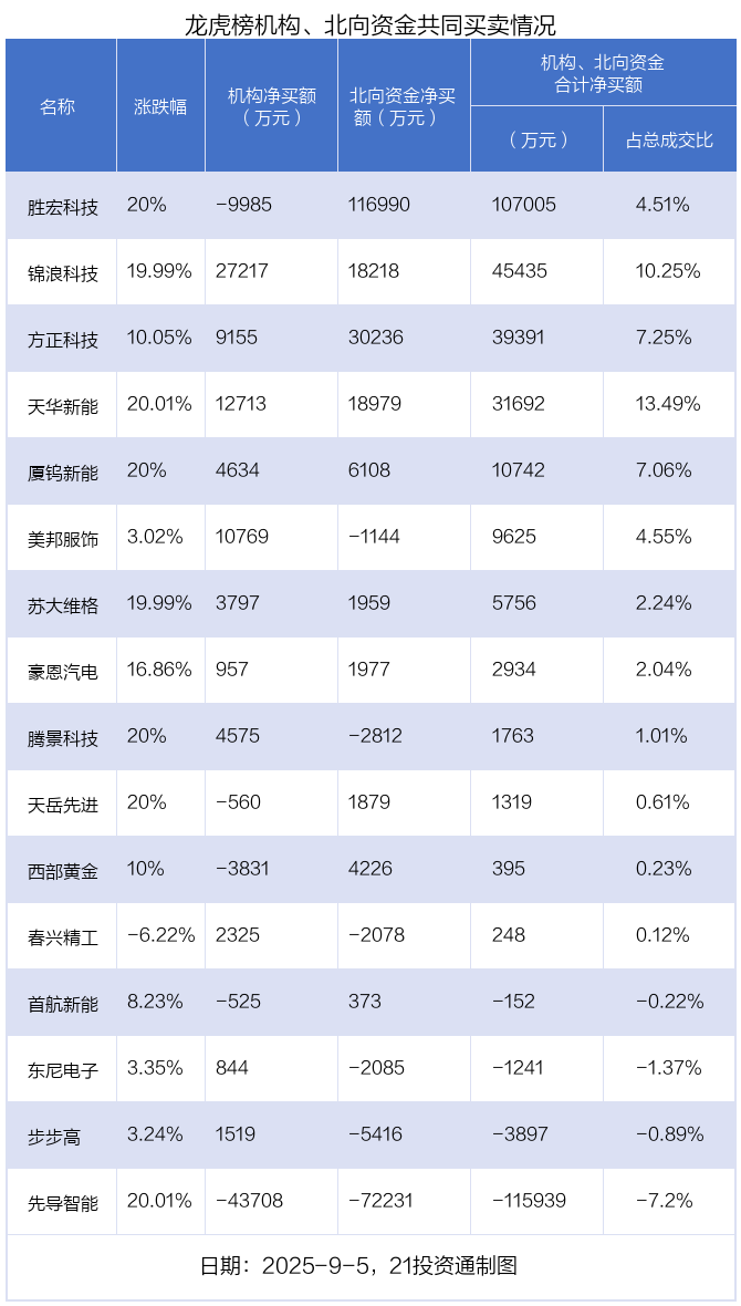 值得注意的是,机构和北向资金共同净买入了方正科技、天华新能、锦浪科技、厦钨新能、豪恩汽电、苏大维格等6股;共同净卖出了先导智能;在胜宏科技,西部黄金,天岳先进,首航新能,美邦服饰,春兴精工,东尼电子,腾景科技,步步高上出现分歧,机构净卖出胜宏科技9985.32万元,北向资金净买入11.7亿元;机构净卖出西部黄金3831.19万元,北向资金净买入4226.08万元;机构净卖出天岳先进560.38万元,北向资金净买入1879.05万元;机构净卖出首航新能525.26万元,北向资金净买入372.89万元;机构净买入美邦服饰1.08亿元,北向资金净卖出1143.71万元;机构净买入春兴精工2325.46万元,北向资金净卖出2077.55万元;机构净买入东尼电子843.6万元,北向资金净卖出2084.52万元;机构净买入腾景科技4574.82万元,北向资金净卖出2812.06万元;机构净买入步步高1519.24万元,北向资金净卖出5416.05万元。