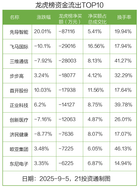 而龙虎榜中资金净流出最多的是先导智能(300450.SZ),被净卖出为8.71亿元,占总成交金额的5.41%。先导智能收盘上涨20.01%,换手率为19.94%。