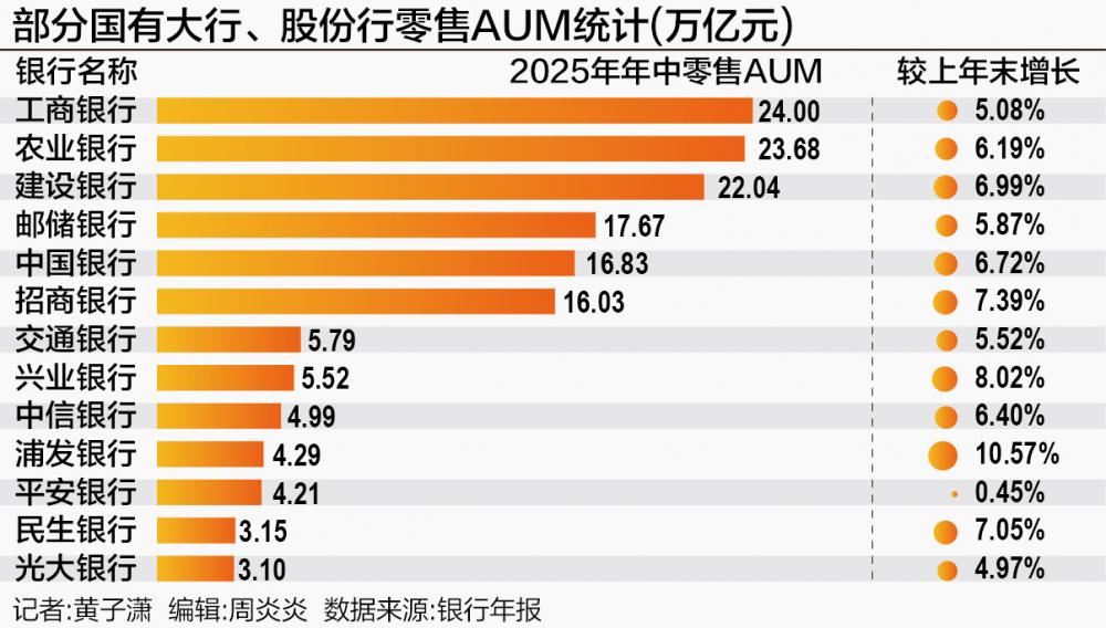 21世纪经济报道注意到,“零售AUM(管理零售客户总资产)”在中报季中被多家银行反复提及。这一指标被视为大财富管理的“基本盘”、部分银行口中“北极星”指标,是衡量银行零售综合能力的一个关键参考值。