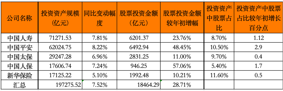 注:2025年上半年五大上市险企的投资资产规模及股票投资金额等数据对比分析;数据来源险企2025年半年报。