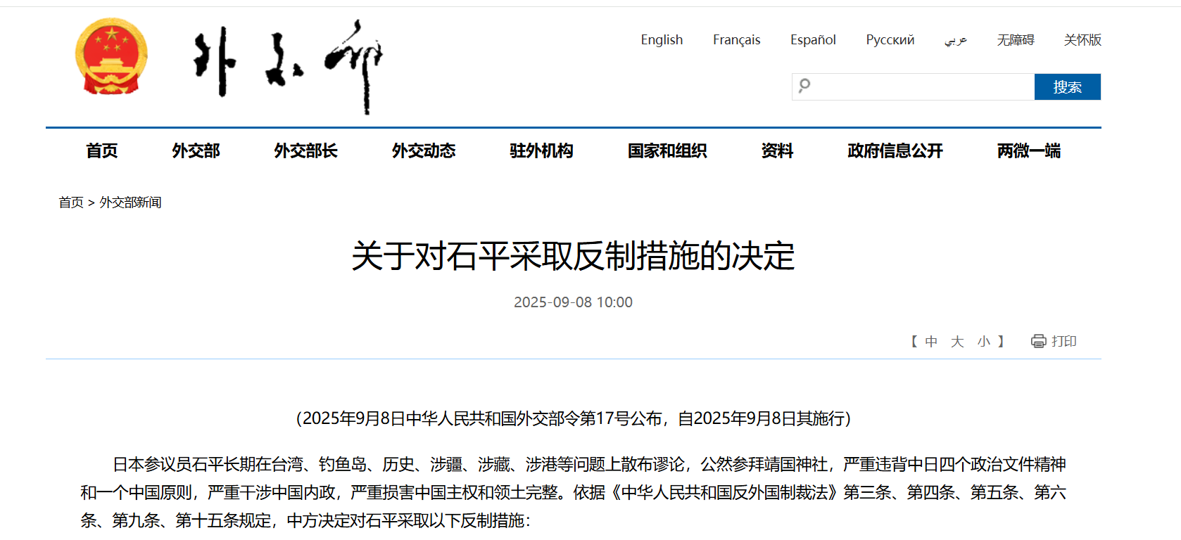 日本参议员石平长期在台湾、钓鱼岛、历史、涉疆、涉藏、涉港等问题上散布谬论,公然参拜靖国神社,严重违背中日四个政治文件精神和一个中国原则,严重干涉中国内政,严重损害中国主权和领土完整。依据《中华人民共和国反外国制裁法》第三条、第四条、第五条、第六条、第九条、第十五条规定,中方决定对石平采取以下反制措施: