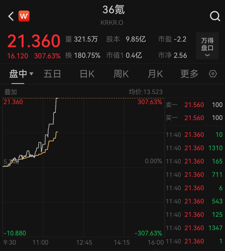 9月8日截至23:39,中概股36氪第六次触发熔断,熔断前大涨307%,报21.36美元/股,成交额达4347万美元,总市值报4000万美元。