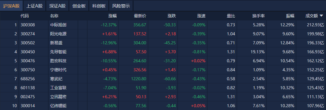 沪深两市半日成交额1.65万亿元,较上个交易日放量2819亿。个股方面,中际旭创成交额超212亿元居首,阳光电源、新易盛、先导智能成交额靠前。