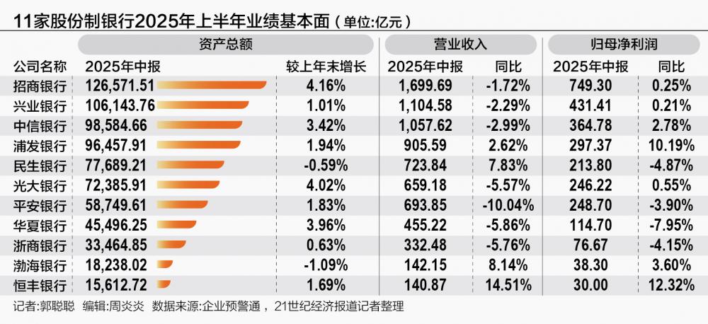 2025年上半年,11家股份制银行合计实现营业收入接近8000亿元,同比下滑1.85%;实现归母净利润逾2800亿元,同比微增0.42%,整体呈现“营收承压、净利润分化”的态势。